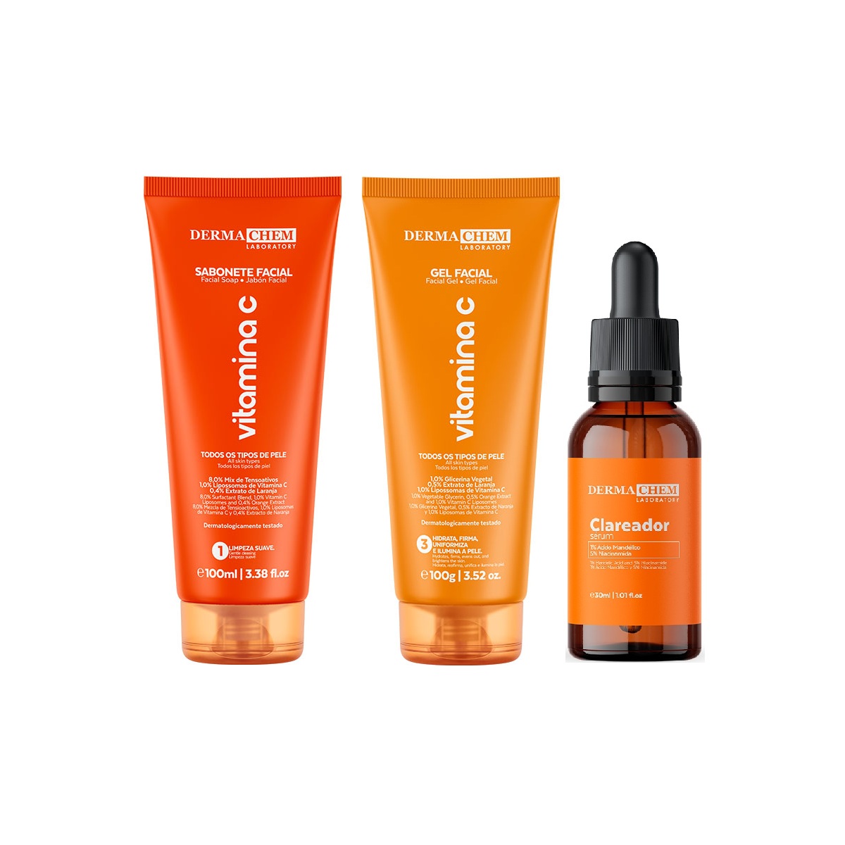 Conheça o Kit Skincare Vita C + Clareador: uma solução prática para uma pele radiante e uniforme. Com sabonete de vitamina C para iluminar, sérum clareador com ácido mandélico e niacinamida para reduzir manchas, e hidratante leve para manter a pele macia e protegida, esse kit simplifica sua rotina e deixa sua pele clara e iluminada.